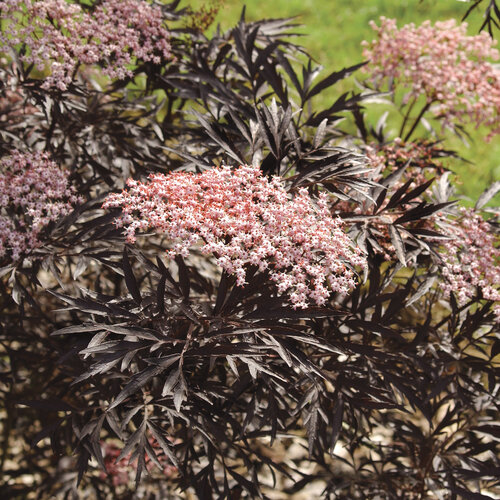 According to the Humane Society of America, elderberry can be toxic to pets if consumed, including Black Lace elderberry. Best in moist soil although will tolerate dry soils, Sambucus nigra Black Lace thrives under acid or alkaline soils. Best if pruned immediately after blooming, this resilient purple leaf elderberry may be pruned to the ground each year and grown like a perennial. Fertilize in early spring by applying a granular fertilizer formulated for trees and shrubs. Follow the label for the recommended rate of application. The color on Black Lace elderberry is best in cool climates; in hot areas, this bold black foliage shrub may grow primarily green foliage. |
